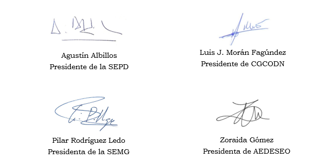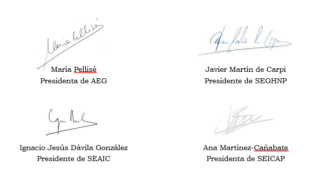 Los representantes institucionales de la Asociación Española de Gastroenterología (AEG), la Sociedad Española de Alergología e Inmunología Clínica (SEAIC), la Sociedad Española de Gastroenterología, Hepatología y Nutrición Pediátrica (SEGHNP), la Sociedad Española de Inmunología Clínica, Alergología y Asma Pediátrica (SEICAP), la Sociedad Española de Médicos Generales y de Familia (SEMG), la Sociedad Española de Patología Digestiva (SEPD), el Consejo General de Colegios Oficiales de Dietistas-Nutricionistas (CGCODN) —todas ellas entidades directamente implicadas en la atención a pacientes, la formación y la investigación en torno a la Esofagitis Eosinofílica (EoE)— se adhieren al espíritu y a las reivindicaciones del primer Día Mundial de la EoE y manifiestan: